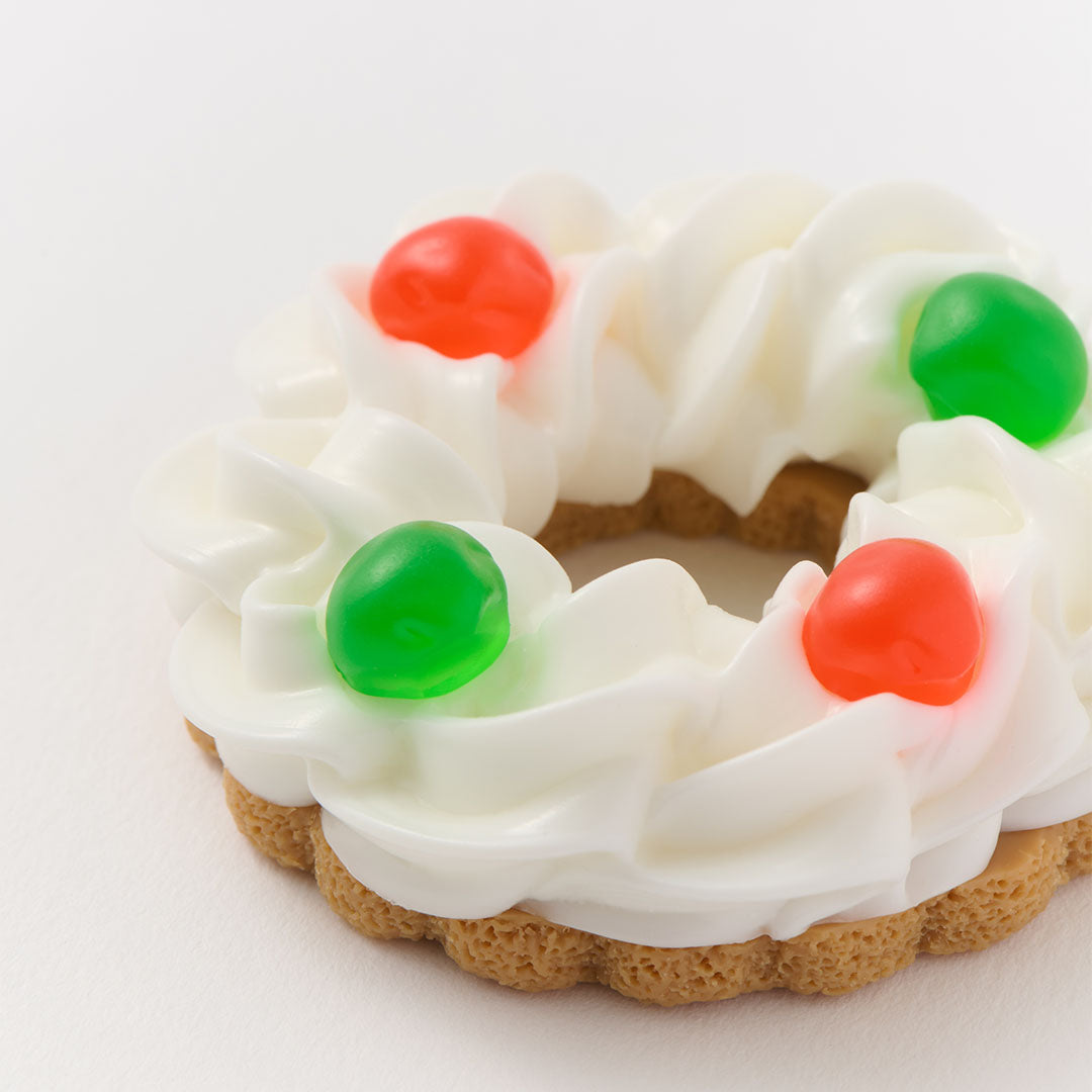 Adorned with colorful glace cherries that sparkle like jewels on the buttercream, beneath the cream lies a layer of crispy cookie dough, adding a delightful crunch. The wreath-shaped cake with delicate touch and details make it like a real sweet. Made in Japan and carefully finished by craftsmen.