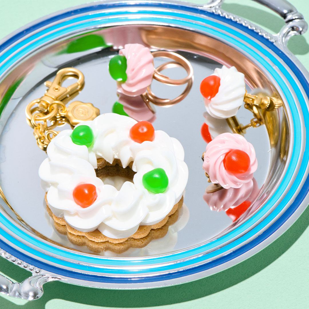The vividly red and green candied cherry cake has been transformed into a Q-pot. accessory. The cake with the sweetness of syrup-soaked cherries offers a rich flavor that is both retro and nostalgic, yet fresh and modern.