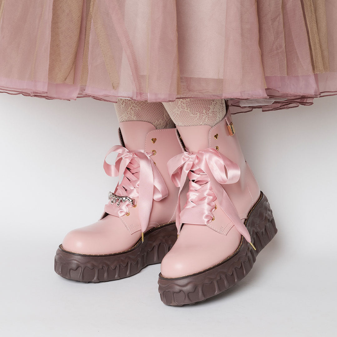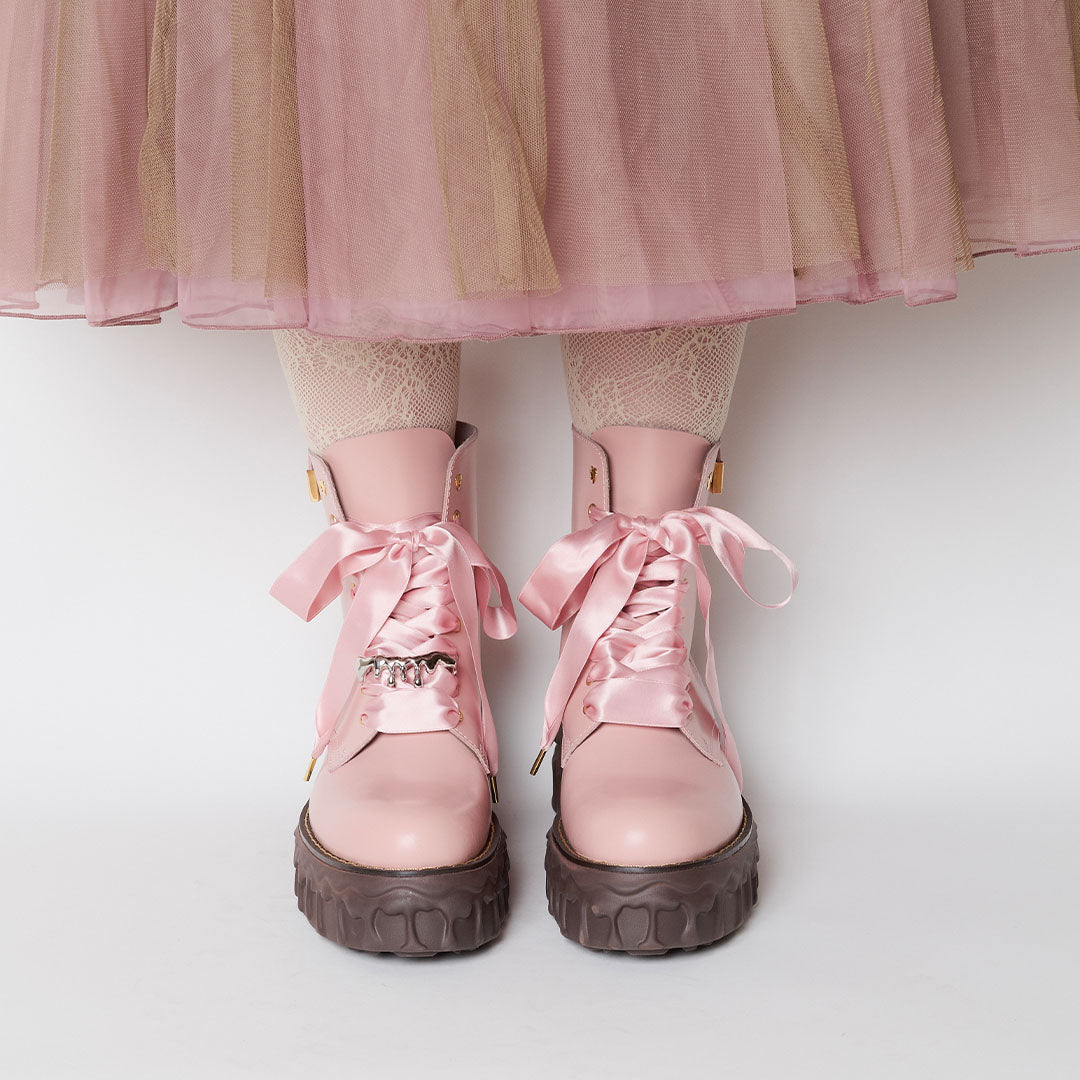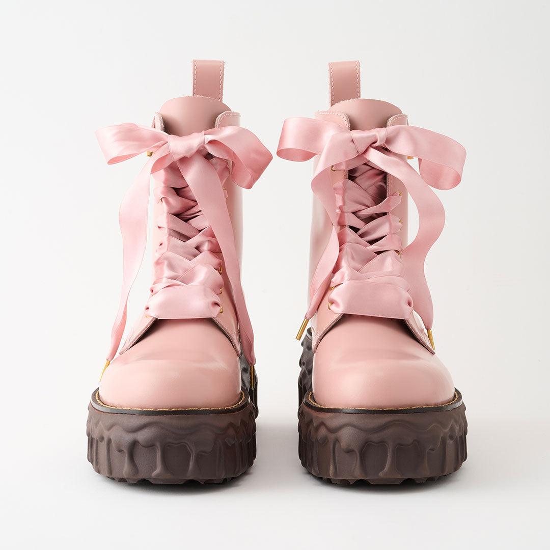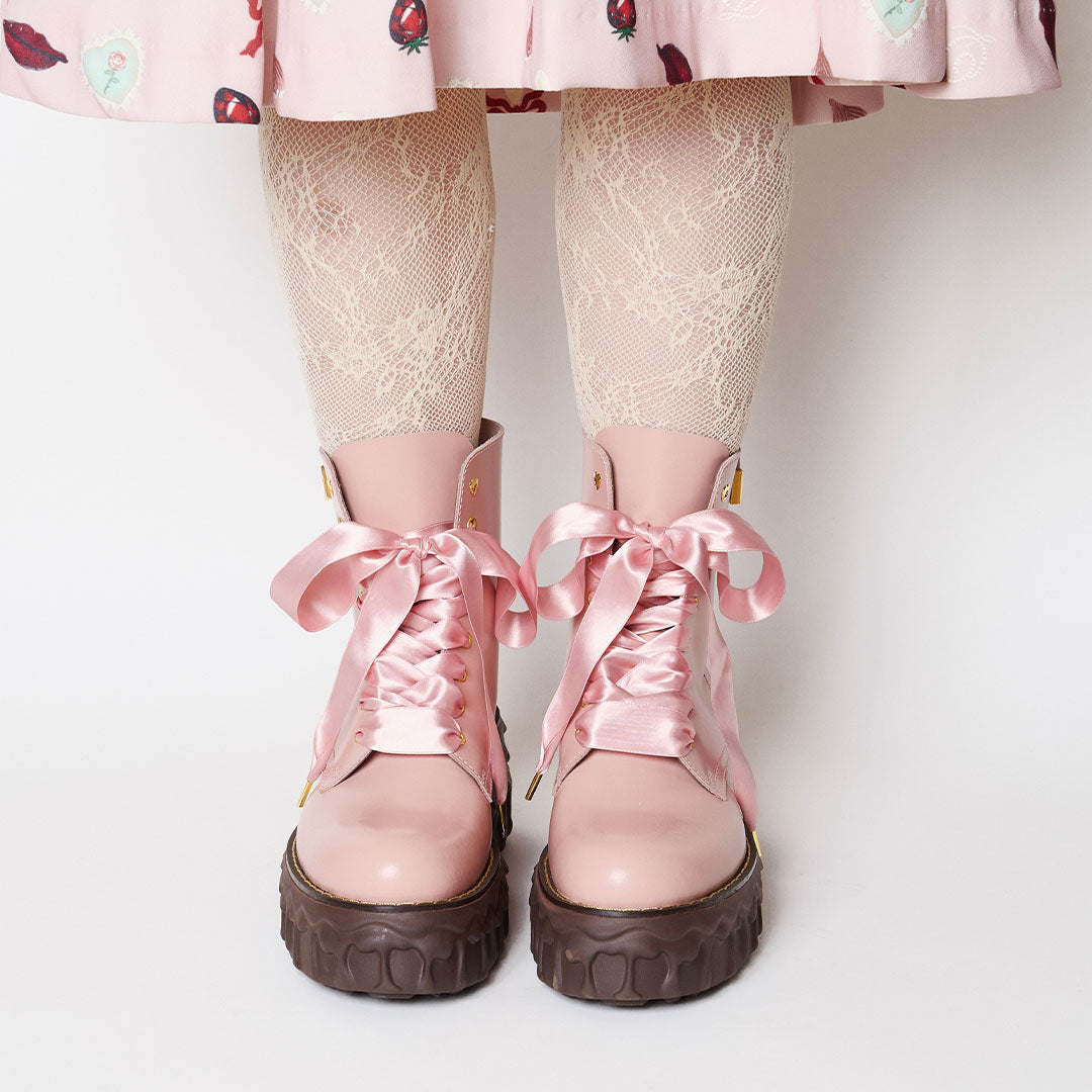 Melting Chocolate Satin Ribbon Lace Up Leather Boots (Pale Pink)【Japan Jewelry】