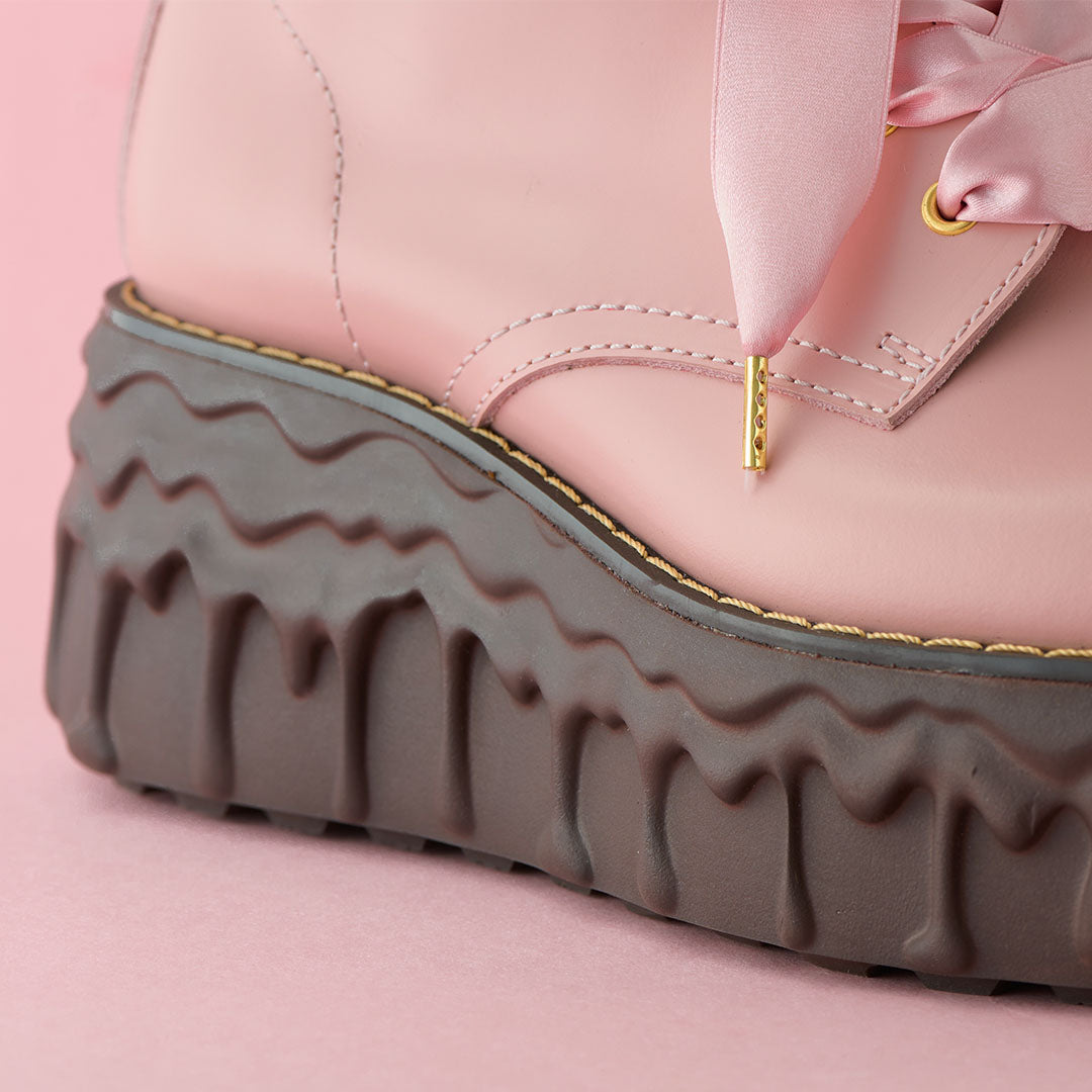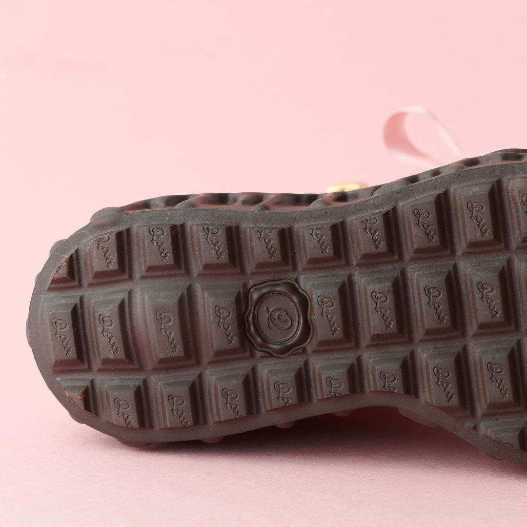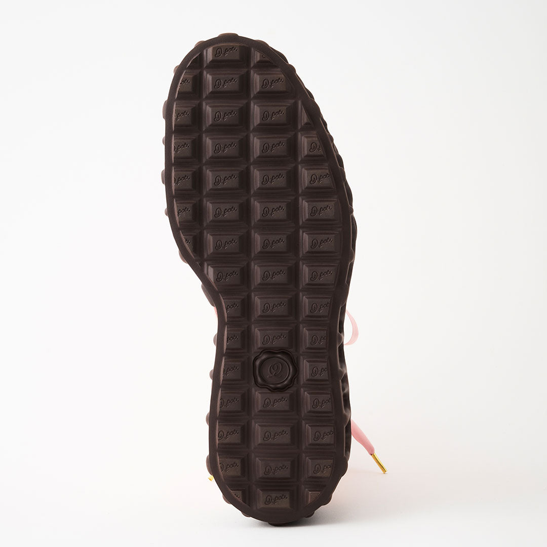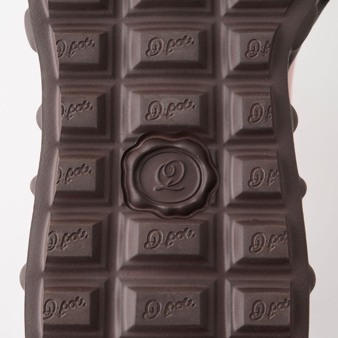 The impactful sole that melts over 3 layers is surprisingly light contrary to the decorative design, showing the designer's thoughts of "walk lightly on the path of life" with an eye-catching design. Highly cushioned and extremely light sole is also one of the charms of Q-pot. SHOES. The bottom of the sole is tablet chocolate designed, after walking, the pieces of chocolate (=PEACE) spread out.