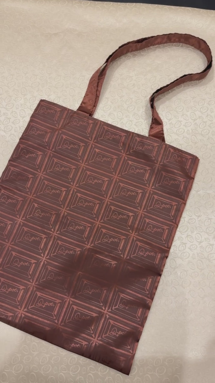 This sophisticated tote bag is subtly refined, boasting a sleek, chic design. Each individual chocolate piece is intricately marked with the "Q-pot." logo, making this an irresistible item for chocolate lovers.