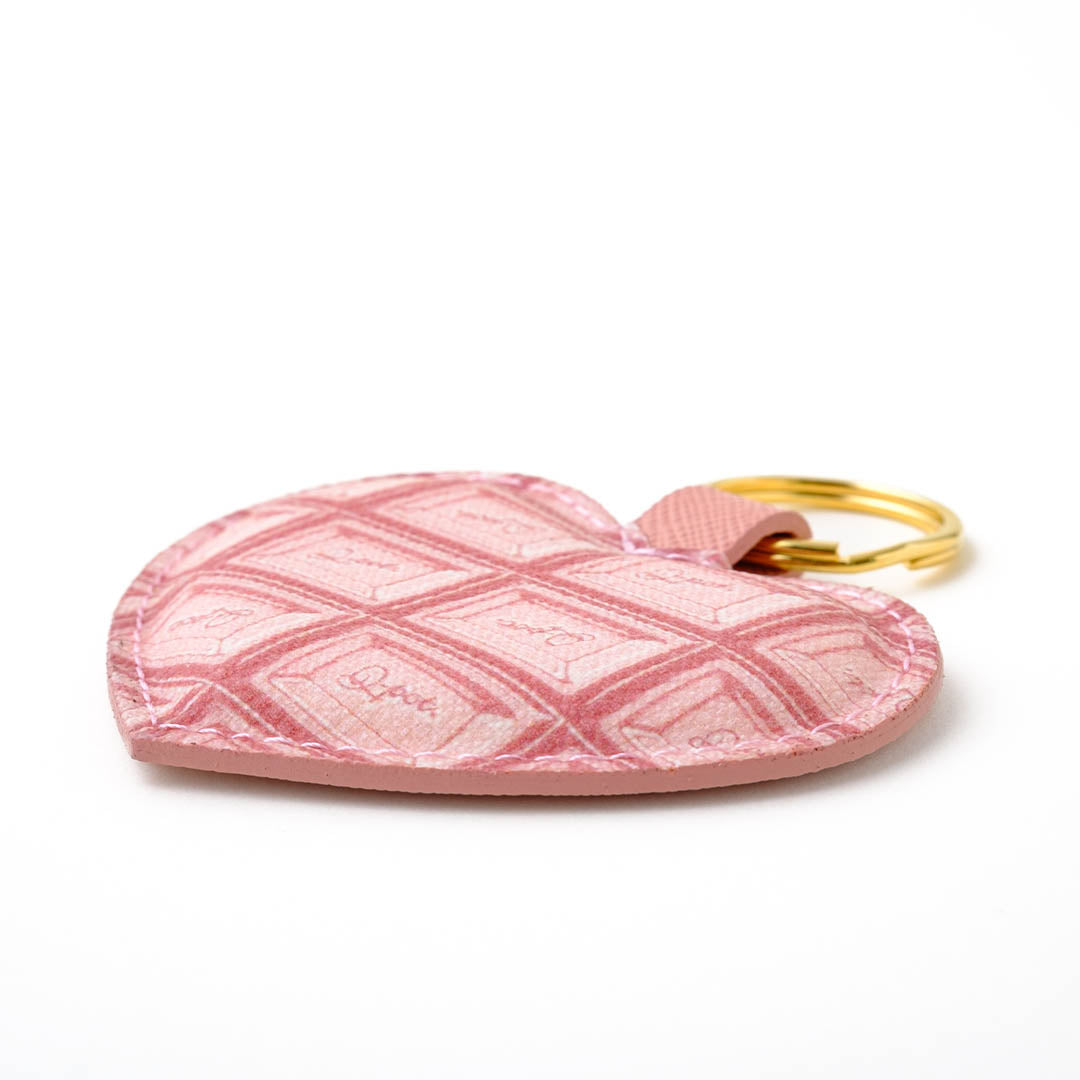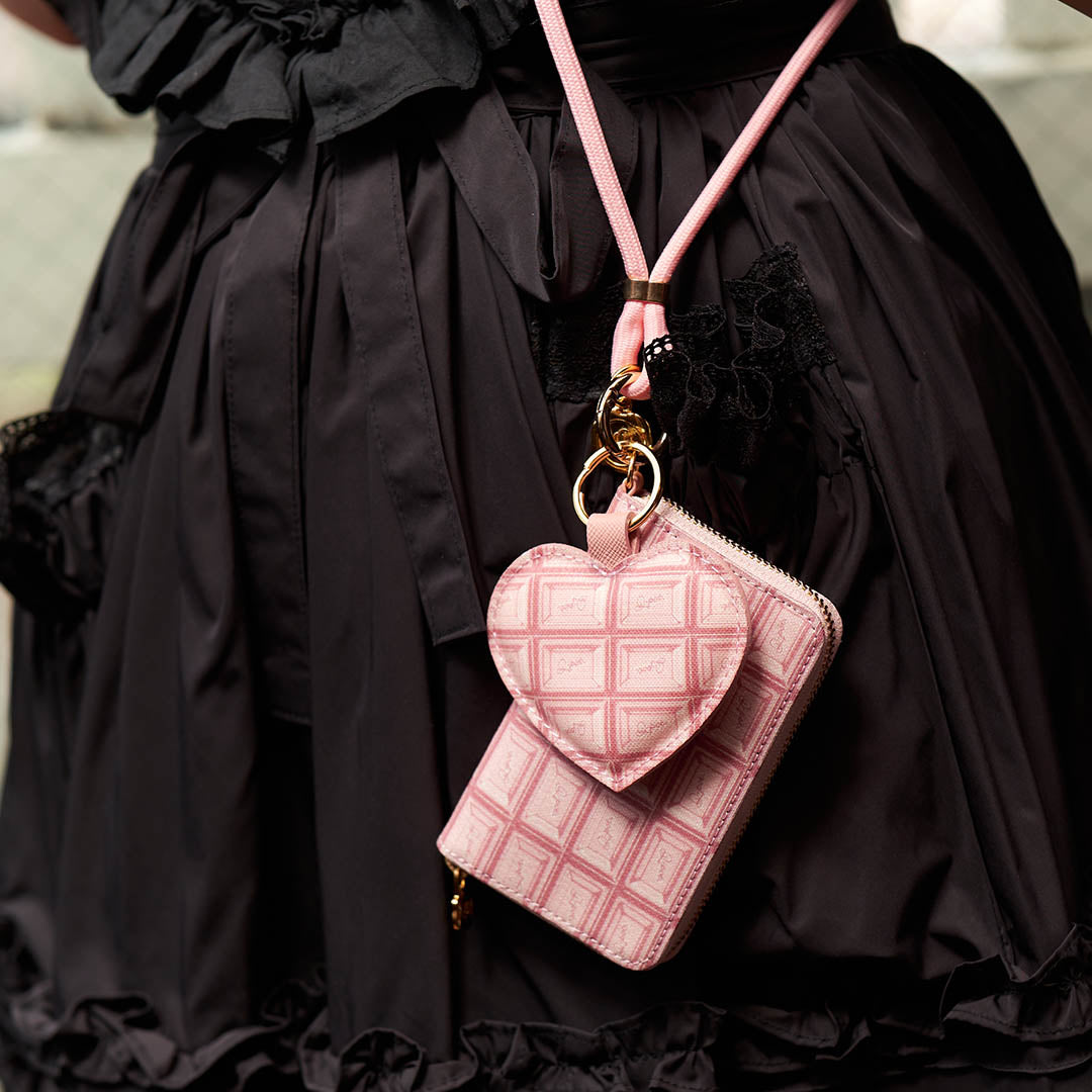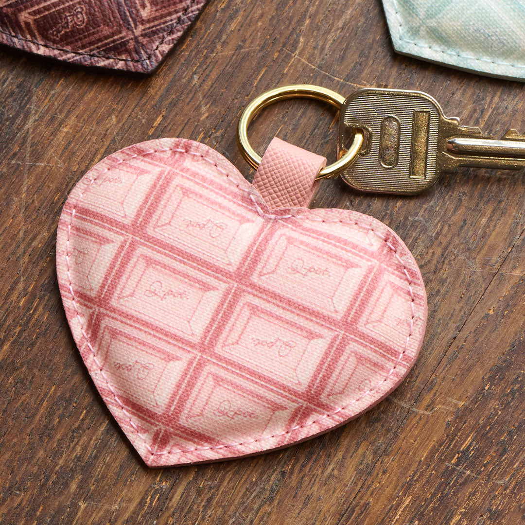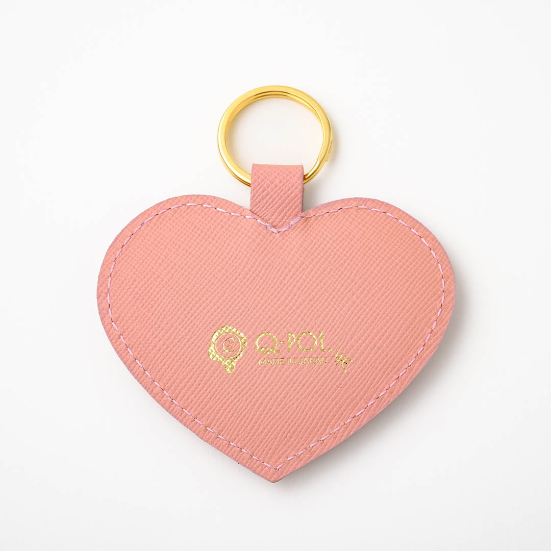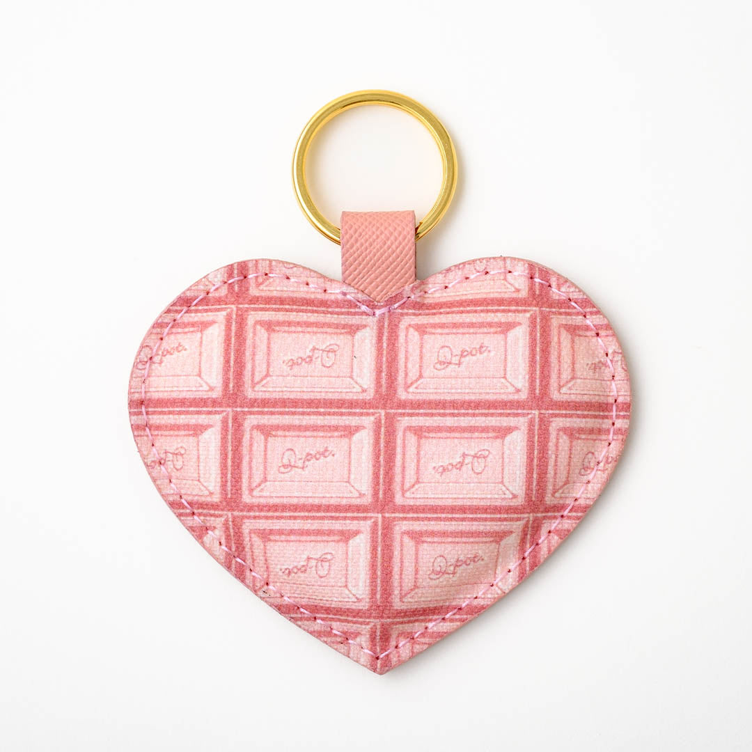 A heart-shaped leather keychain adorned with Q-pot.'s signature motif: the enchanting "Chocolate" that continues to be loved worldwide. The design is chic, sophisticated, and exudes luxury.